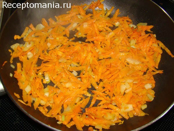 Делаем зажарку. Обжариваем на растительном масле измельченную на крупной терке морковь и нарезанный кубиками лук. Перекладываем в суп и варим 10 минут.