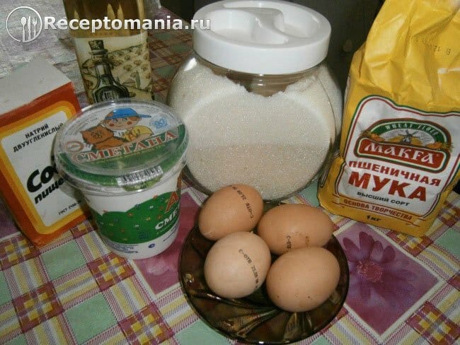 Яйца - 4 шт. Сахар - 1 стакан Сметана - 300 гр. Сода - 1 ч.л. (без горки) Растительное масло - 175 мл. Мука - 2 стаканаПриготовление: