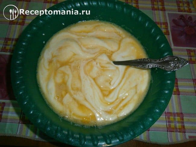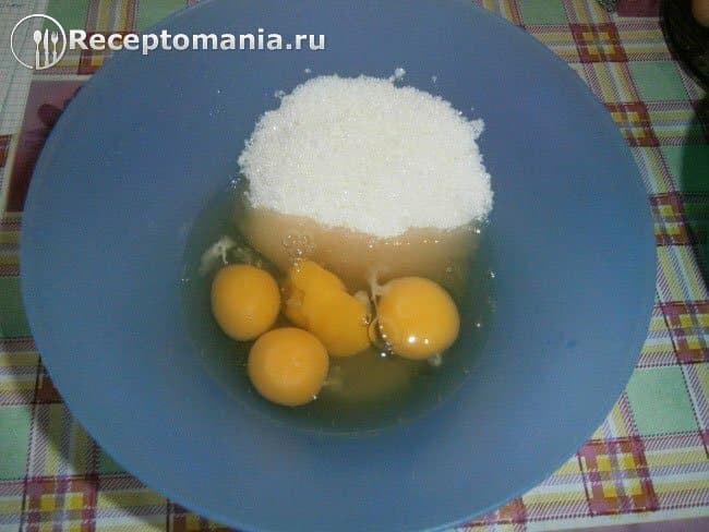 В миску насыпать сахар и яйца, НЕ ВЗБИВАТЬ!!! просто перемешать.