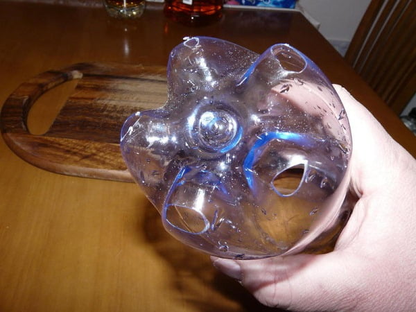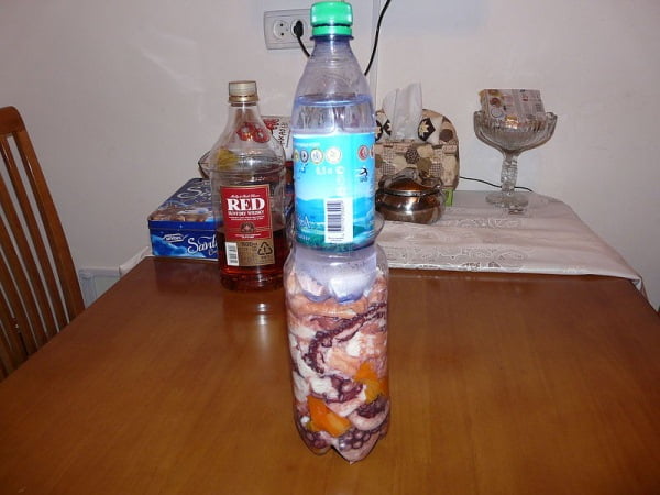 Нарезаем верхнюю часть бутылки лепестками, загибаем их внутрь и фиксируем пищевой пленкой или скотчем. Убираем в холодильник на 24 часа.