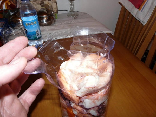Набиваем плотно полбутылки осьминогом, чередуя с морковкой. Сверху кладем гнет на 20 минут.