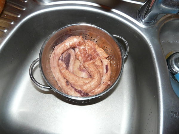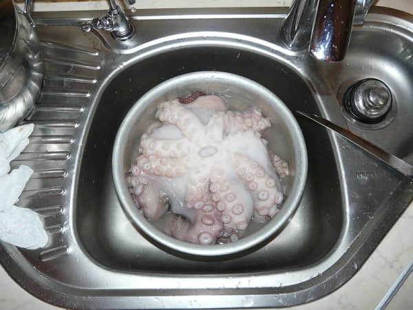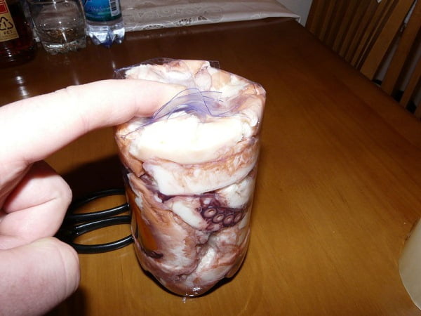 Размораживаем осьминога, промываем, удаляем клюв, глаза, чернильный мешок, обдираем шкуру с головы, со щупальцев убираем жилки, пленки и присоски в средней части.
