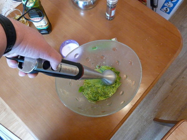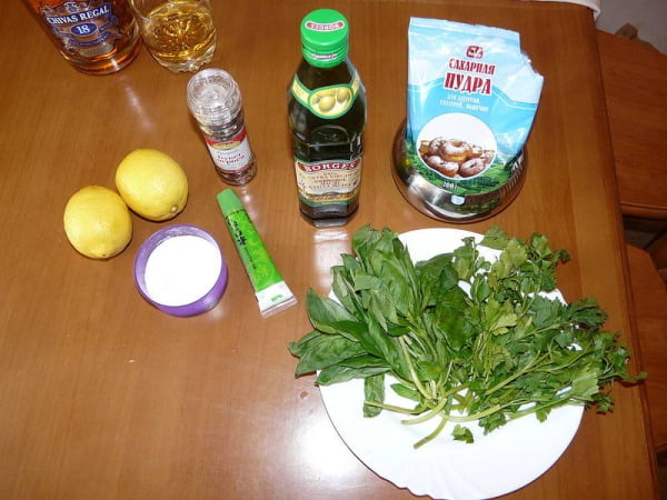 Приготовим соус. Для этого базилик и петрушку немного рвем, кто любит, кладем немного васаби, выжимаем лимон, солим, добавляем немного сахарной пудры, наливаем оливкового масла и измельчаем блендером до однородной консистенции.