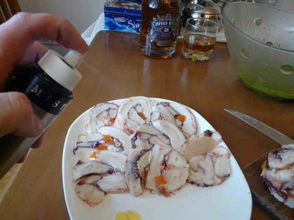 Сильно не остужаем, берем горячего осьминога и нарезаем его и морковь.