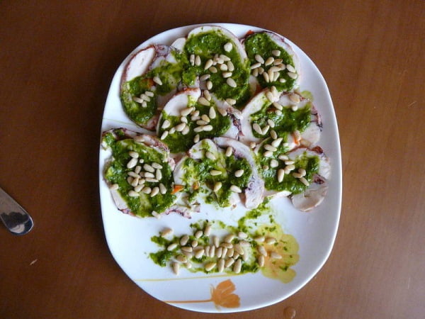 Осьминог Морковь – 2 шт. Лук – 1 шт. Черный перец горошком Белый перец горошком Лимонная трава Кокосовое молоко Лавровый лист Ягоды можжевельника Лимонный сок Оливковое масло Лимон Базилик свежий Петрушка свежая Васаби Кедровые орешки Сахарная пудра СольПриготовление: