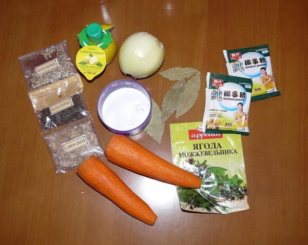 В кастрюлю с холодной водой кладем две морковки, лук, черный, белый перец горошком, кокосовое молоко, лимонную траву, лаврушку, лимонный сок, ягоды можжевельника и соль.