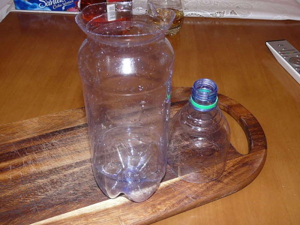 Пока вариться осьминог приготовим контейнер. Берем полуторалитровую бутылку, разрезаем на две части, в нижней делаем отверстия для отвода жидкости.