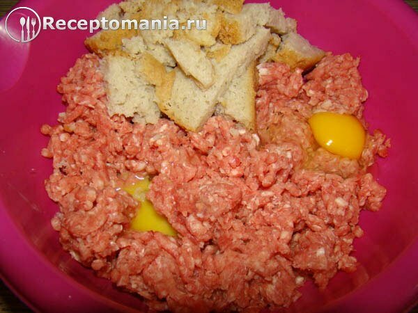 Добавляем в фарш яйца и хлеб, предварительно вымоченный в кипятке. Перемешиваем.