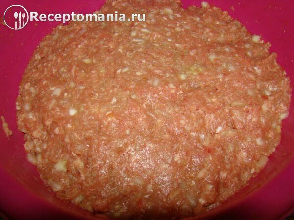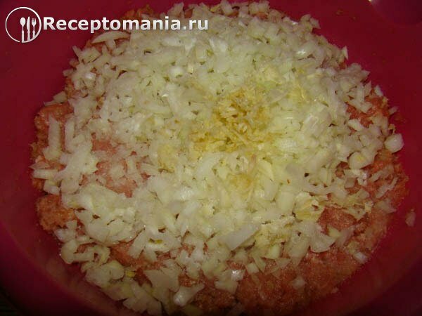 Лук, нарезанный мелкими кубиками и чеснок, измельченный на мелкой терке, добавляем в фарш, солим, перемешиваем.