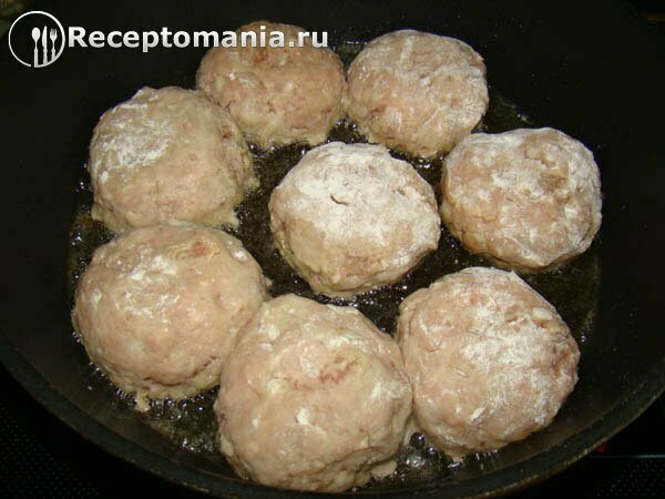 Насыпаем в тарелку муку, формируем котлету и обваливаем. После каждой котлеты смывайте муку с пальцев под проточной водой, иначе фарш начнет к ним прилипать. Получившуюся котлету выкладываем на разогретую с растительным маслом сковороду.