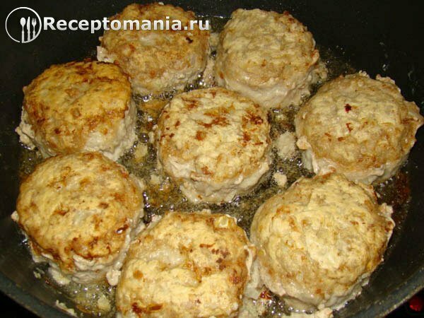 Обжариваем с двух сторон на среднем огне до золотистой корочки. Огонь не делайте на максимум, иначе котлеты зарумянятся, но не прожарятся внутри. Приготовление занимает около 15 минут, зависит от размера котлеты. Если Вы не уверены в готовности, немного разрежьте и из нее выйдет сок, сок должен быть прозрачный.