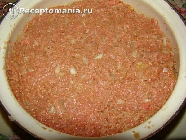 Смешиваем в одной посуде фарш, лук, нарезанный кубиками, яйца, предварительно замоченный хлеб в горячей воде, измельченный на мелкой терке чеснок, соль.