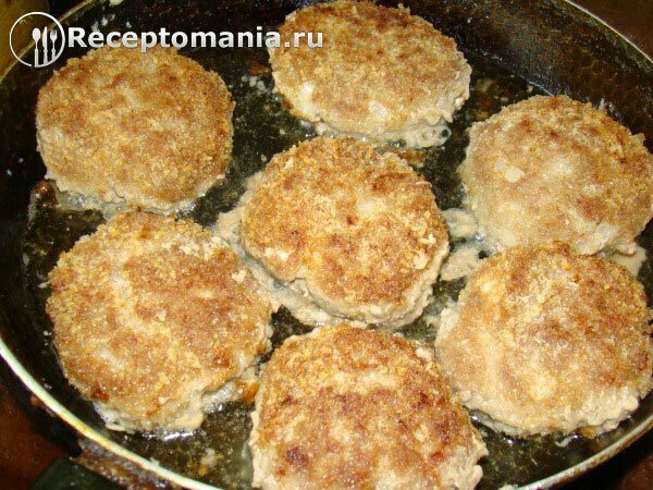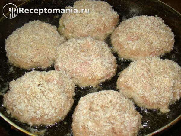 Формируем котлеты, опускаем в тарелку с сухарями, выкладываем на хорошо разогретую сковороду и обжариваем с двух сторон на среднем огне около 15 минут.