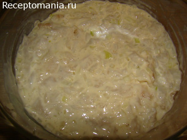 Делаем кляр. Для этого взбить два яйца и добавить муки, перемешать до однородной консистенции, после добавить майонез и все еще раз перемешать.