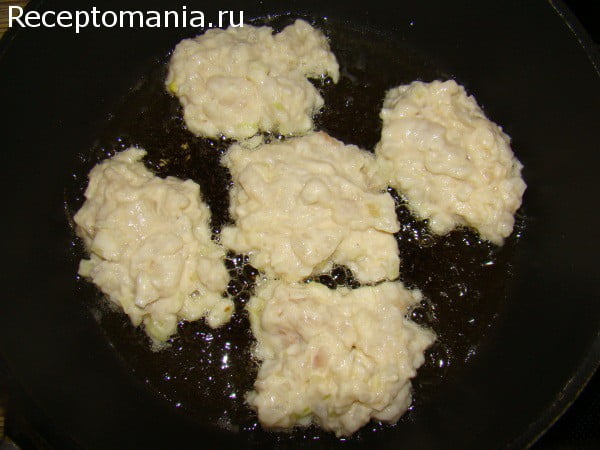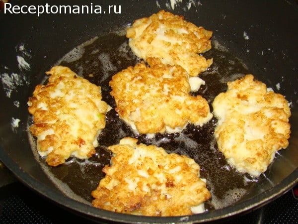 На хорошо разогретую сковороду с растительным маслом выкладываем филе камбалы, формируя котлеты. Обжариваем на среднем огне около 10 минут.