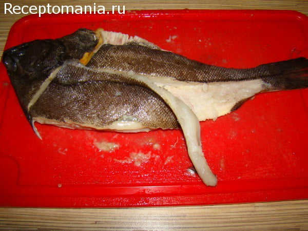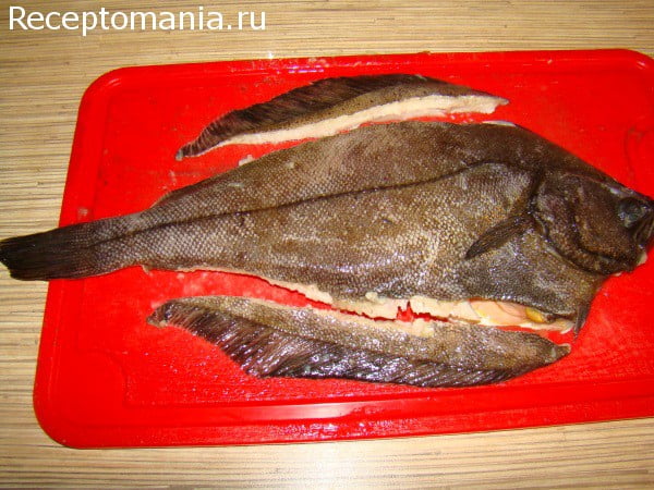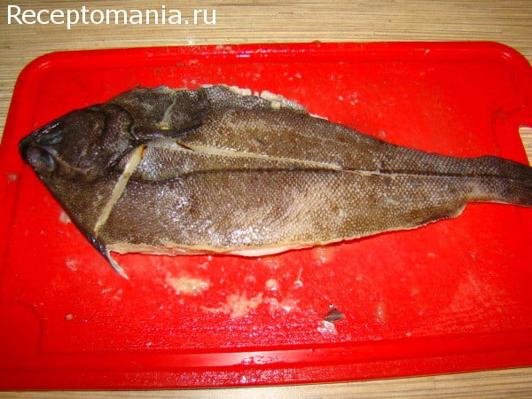 Делаем разрез вдоль всей спины камбалы и около головы.