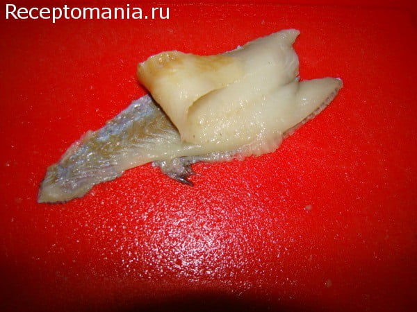 Начинаем отделять филе, срезая его аккуратно с костей. Так проделываем с двух сторон рыбы.