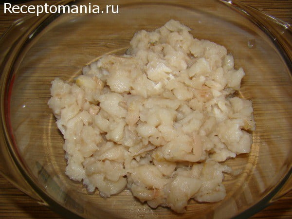 Переливаем кляр в тарелку к рыбе. Солим и оставляем немного настояться. Если вы видите, что получилась жидкая консистенция и котлеты могут развалиться, добавьте еще муки.