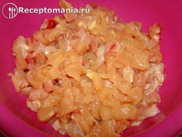Нарезать филе курицы на небольшие кусочки.