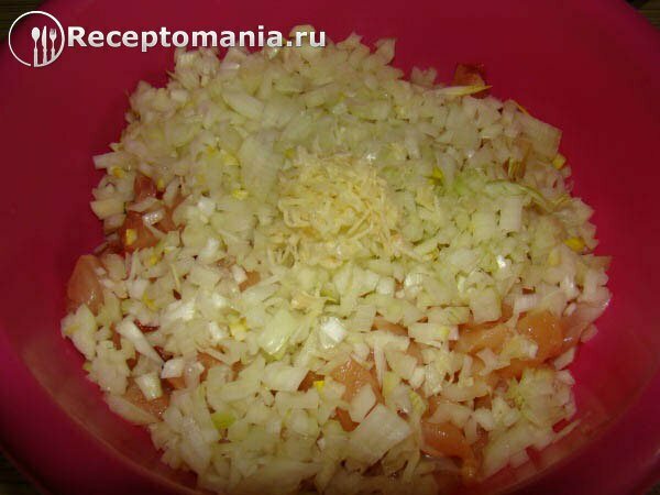 Нарезаем мелко лук и измельчаем на мелкой терке чеснок.