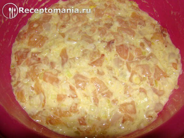 Немного венчиком взбиваем яйца, добавляем муки и перемешиваем до однородной консистенции, после кладем майонез и все еще раз перемешиваем.