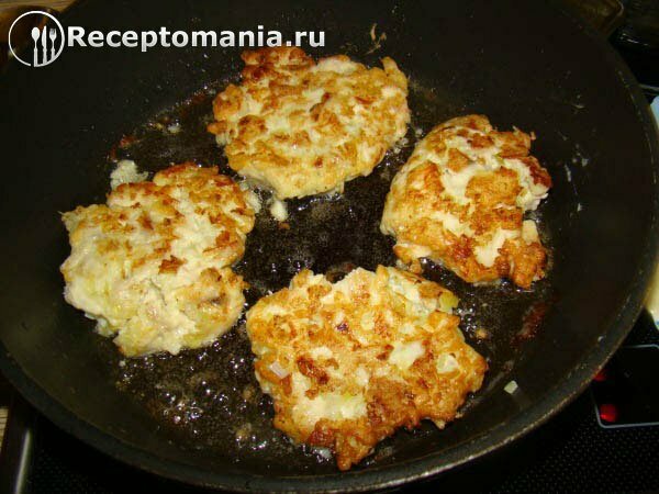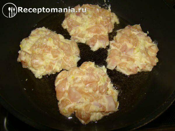 На хорошо разогретую сковороду с растительным маслом столовой ложкой выкладываем филе курицы, формируя котлету. После уменьшаем огонь до среднего и обжариваем с двух сторон.