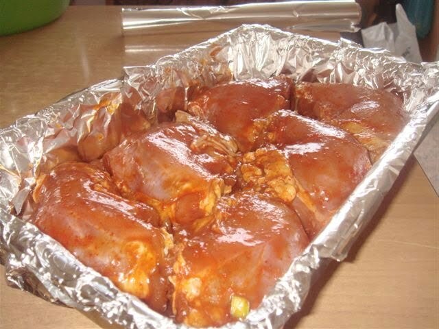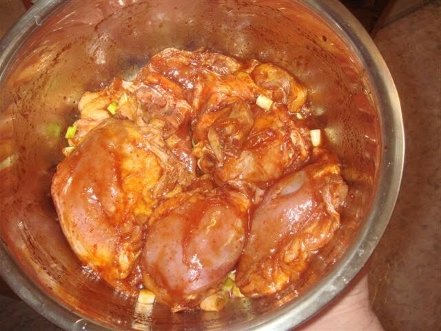 Для приготовления этого блюда нужно замариновать бедра, лучше это сделать с вечера, чтобы на следующий день запечь. Чем дольше маринуется мясо, тем ароматней и мягче оно получиться. Для маринада смешаем соевый соус, перечную пасту с уксусом, мед, рисовый или яблочный уксус, кунжутное масло, кайенский перец или корейского чили, соль.