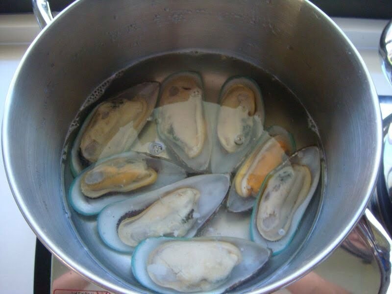 Разморозить мидии, переложить в кастрюлю, воду посолить, варить 15 мин.