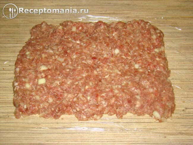 Выкладываем фарш на пищевую пленку толщиной примерно 1 см.