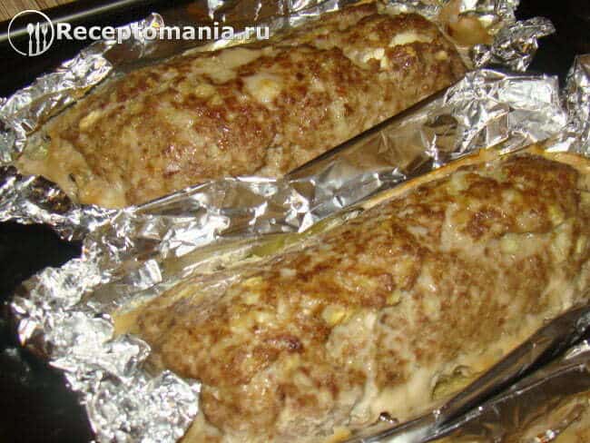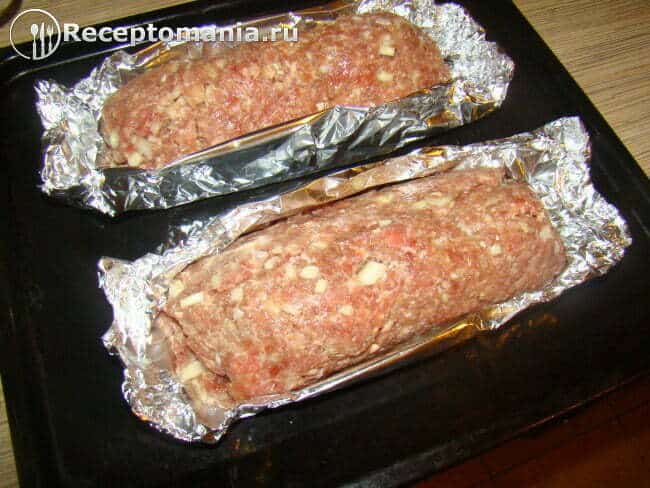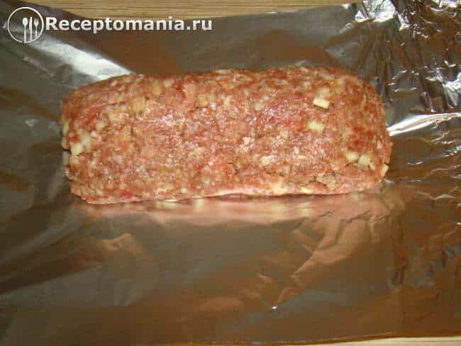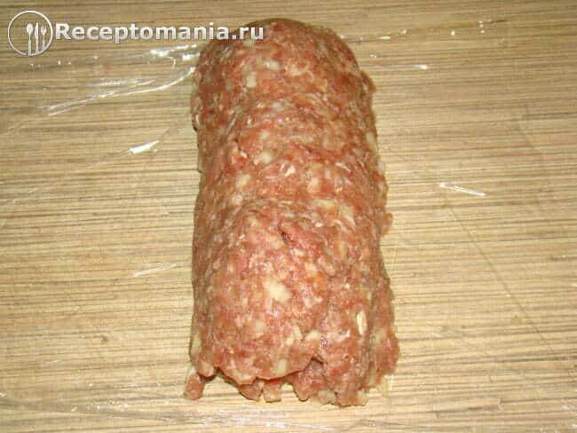 С помощью пищевой пленки заворачиваем фарш в рулет.