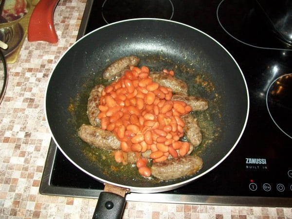 Выкладываем фасоль в сковороду с мясом лося, добавляем соевого соуса и немного воды. Тушим 15-20 минут на слабом огне.