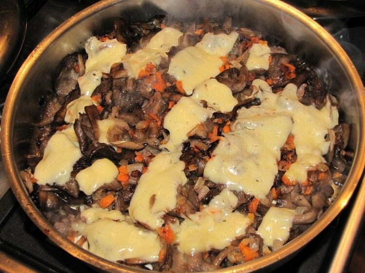 Разделяем грибы с луком на две части. На дно сотейника кладем грибы с луком, морковь, далее слой лосятины, сверху засыпаем оставшимися грибами. Можно добавить немного сыра, закрыть крышкой и поставить на медленный огонь минут на 10-15.