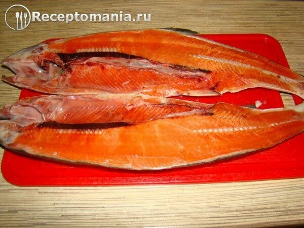 Очищает от внутренностей и чешуи, разрезаем пополам по хребту.