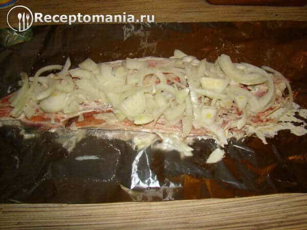 Второй кусок нерки маринуем также, только сверху добавляем лук, нарезанный полукольцами.
