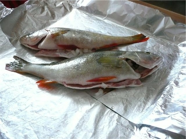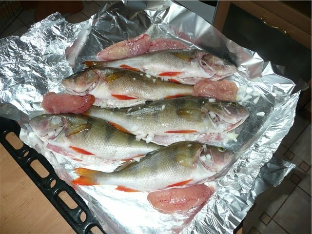 Размораживаем рыбу, солим. На противень расстилаем фольгу и немного смазываем растительным маслом. Нарезаем лук и укладываем его в брюхо к рыбе. Выкладываем окуней и подгибаем края фольги. Если окунь был с икрой, то ее тоже подкладываем к рыбе. Отправляем в разогретую духовку до 150 градусов на 30 минут.