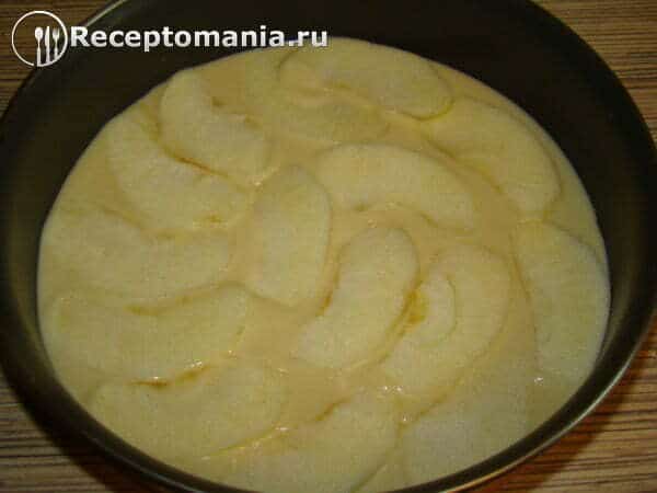 В форму для выпекания, смазанную растительным маслом, выливаем половина теста. Сверху кладем нарезанные яблоки и немного посыпаем сахаром.