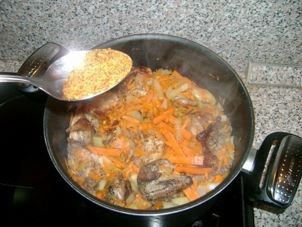 Дичь (вальдшнеп) Лук – 4 шт. Морковь – 1 кг. Рис – 900 гр. Нут – 3 ст.л. Приправа для плова Вода кипяток – 3,5-4 стакана Растительное масло Чеснок – 1 головка СольПриготовление: