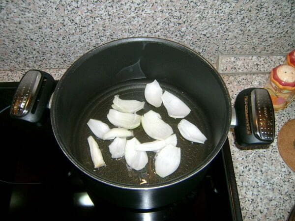 Ставим казан на конфорку и включаем печь на максимальную температуру. Наливаем растительное масло и кладем половину луковицы.