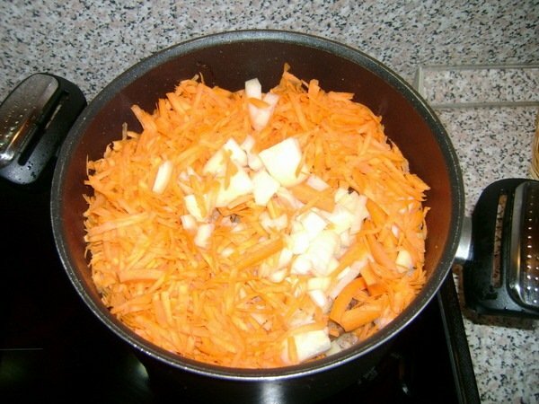 В казан перекладываем лук и морковь, солим и обжариваем на среднем огне.