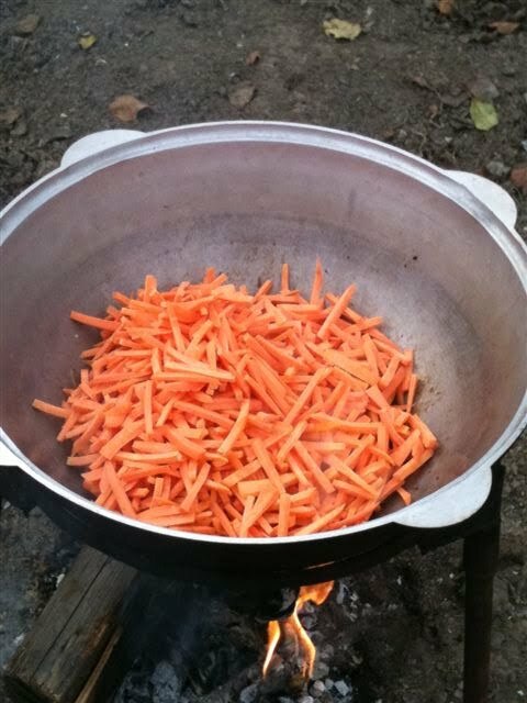 Пока мясо тушиться, нарезать морковь соломкой и положить ее в казан.