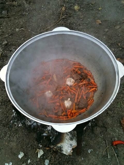 Далее варим зирвак , периодически перемешиваем мясо с морковью, можно посолить по вкусу. Доводим морковь до полуготовности, далее высыпаем приправу для шашлыка. Варим зирвак с приправой 15-20 мин., походу можно бросить кусочек красного перца, но не забыть его вытащить, когда приготовиться зирвак.