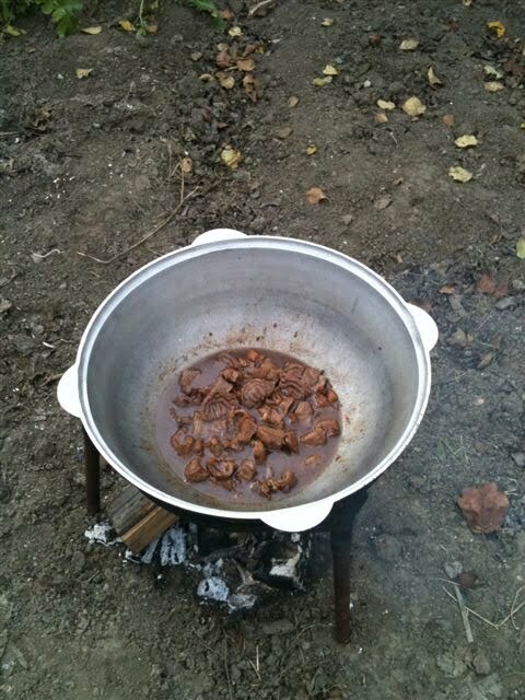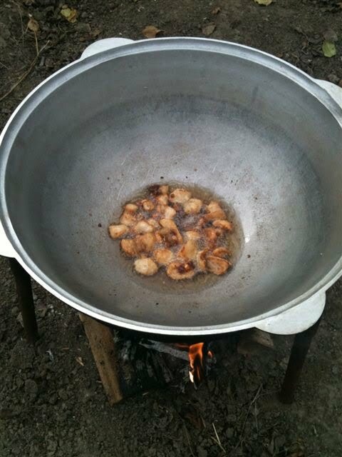 Нарезать крупно сало барашка и далее бросить в казан. После того как жир вытопиться, вытащить шкварки.