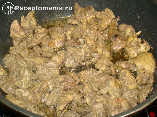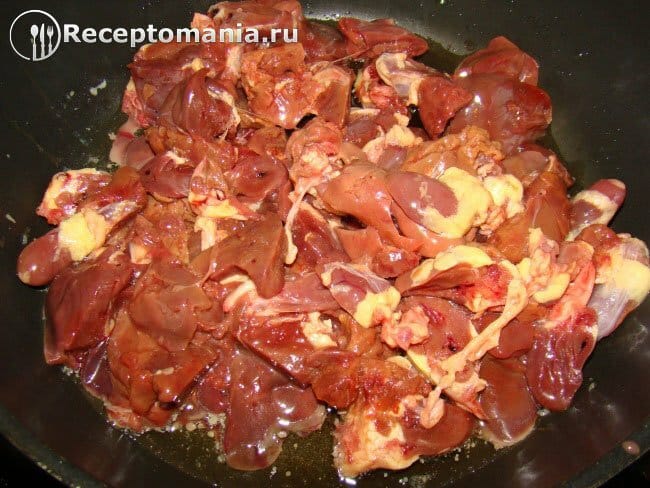 Нарезаем сердце и печень кусочками. Выкладываем на хорошо разогретую сковороду с растительным маслом.