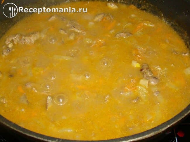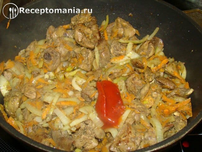Выкладываем к потрохам нарезанный полукольцами лук и измельченную на крупной терке морковь.