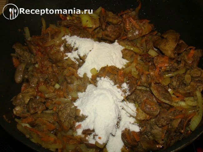 Куриные потроха (сердце, печень) – 800 гр. Лук – 1-2 шт. Морковь - 1 шт. Растительное масло Мука - 2 ст.л. Томатная паста – 1 ст.л. Вода горячая – 500-600 мл. Лавровый лист Перец горошком Зелень СольПриготовление: