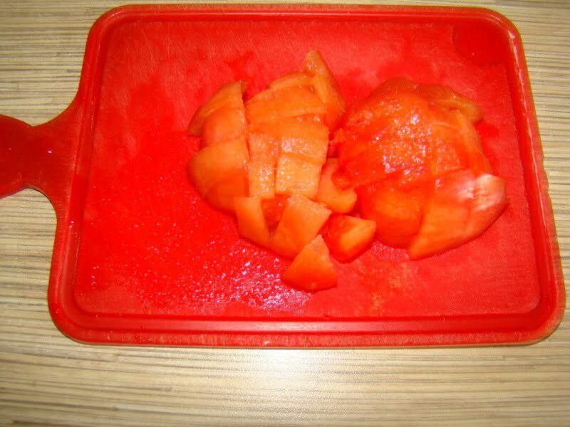 Нарезаем кубиками помидор. Помидоры можно заменить ½ ст.л. томатной пасты, тогда ее кладем в конце приготовления зажарки.
