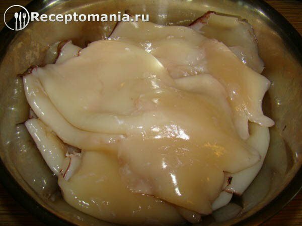 Размораживаем кальмар и очищаем его от шкуры. Для того чтобы легче очистить кальмар от шкуры нужно его обдать кипятком, если кальмар не покупной, а выловленный собственными силами лучше опустить его в кастрюлю с кипятком на 2 минуты, слить воду, а потом приступать к чистке.
