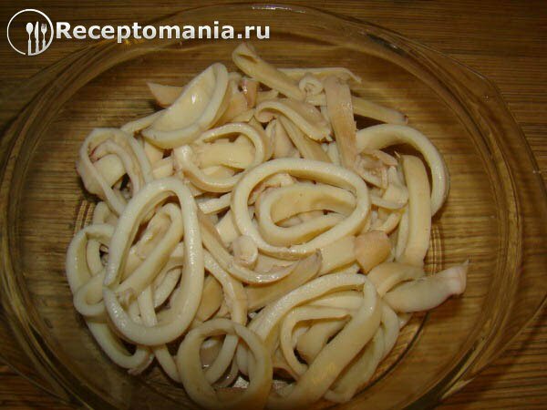 В кастрюлю с кипящей подсоленной водой опускаем кальмар. Не накрывая кастрюлю крышкой, ждем пока он закипит. Как только кальмар стал кипеть, снимаем с огня и сливаем воду.
