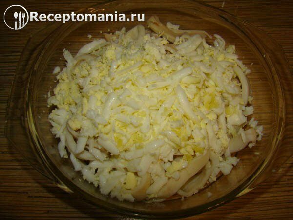 За ранее отвариваем яйца около 10 минут. Измельчаем на крупной терке и добавляем к кальмару.