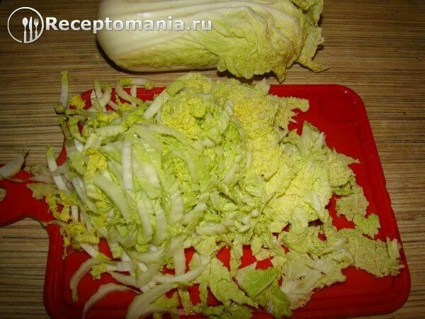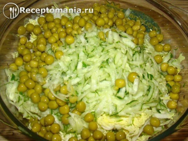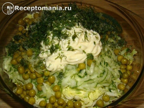 Капуста пекинская – 2 шт. Огурец – 1-2 шт. Горошек консервированный – 200 гр. Майонез Укроп СольПриготовление: